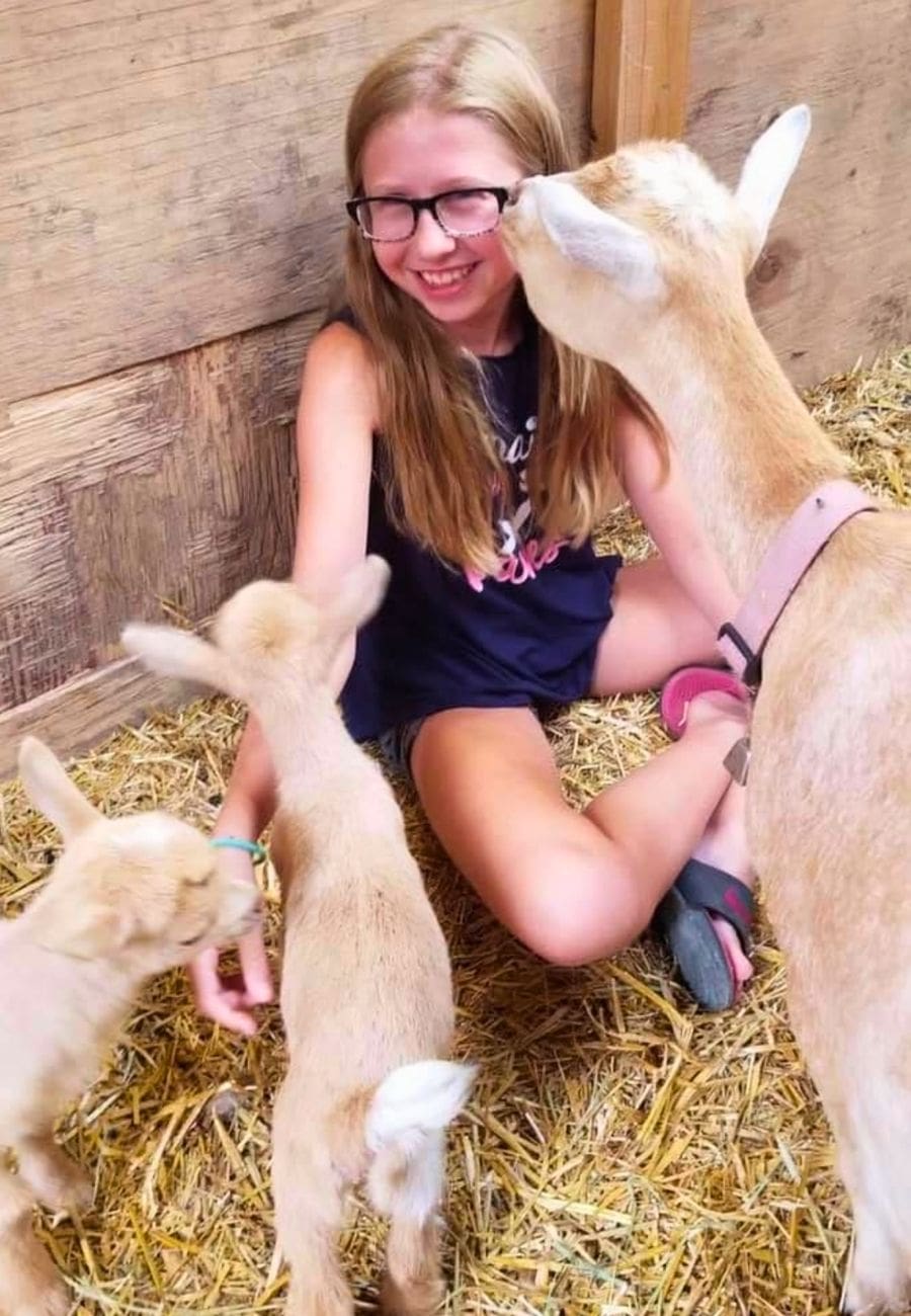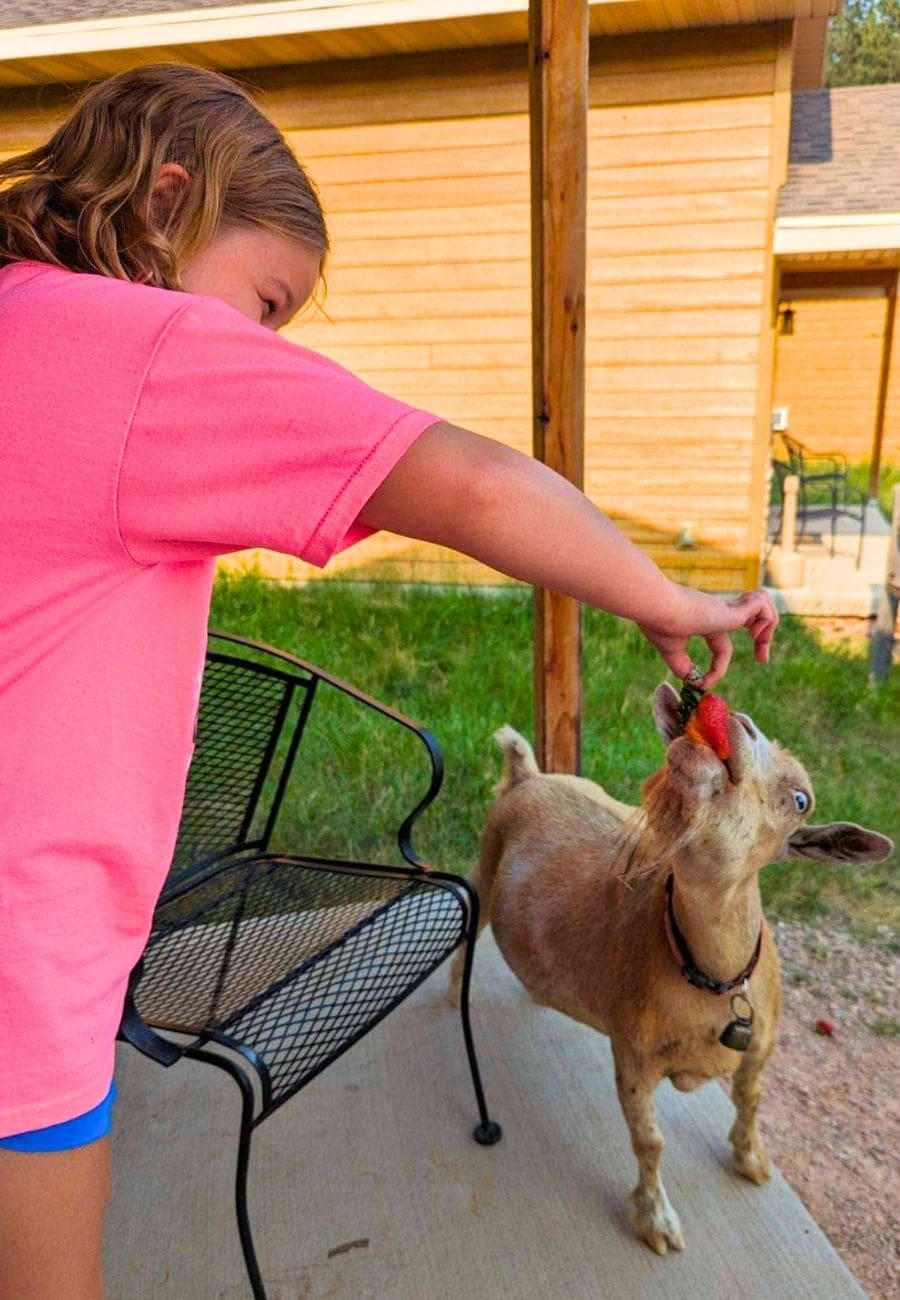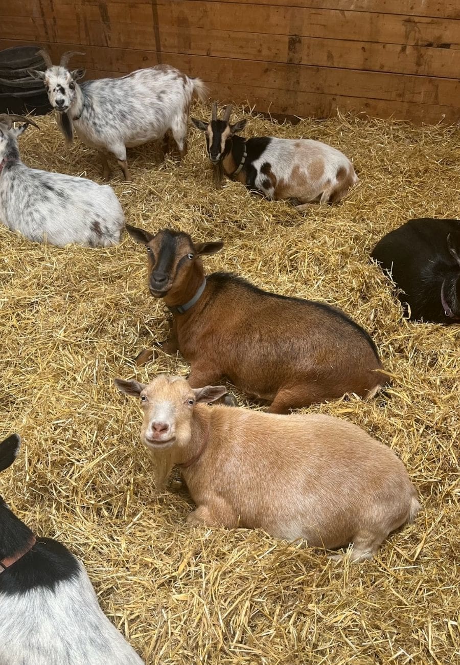 Timber, Daisy, Lilly, Dahlia, Violet, Rosie, and Iris. They are milking goats that produce the highest protein and butterfat content (6-10%) of any dairy goat breed! Because of their small size, prolific milk production, and their ability to breed year-round they are the perfect goats for a small homestead. We breed them in the spring with new babies arriving in the fall. This pregnancy schedule allows us to focus on Campfire Cabins and our growing season. When things slow down in the fall, we have time to milk each day, and mammas and babies get a few quiet months to bond.