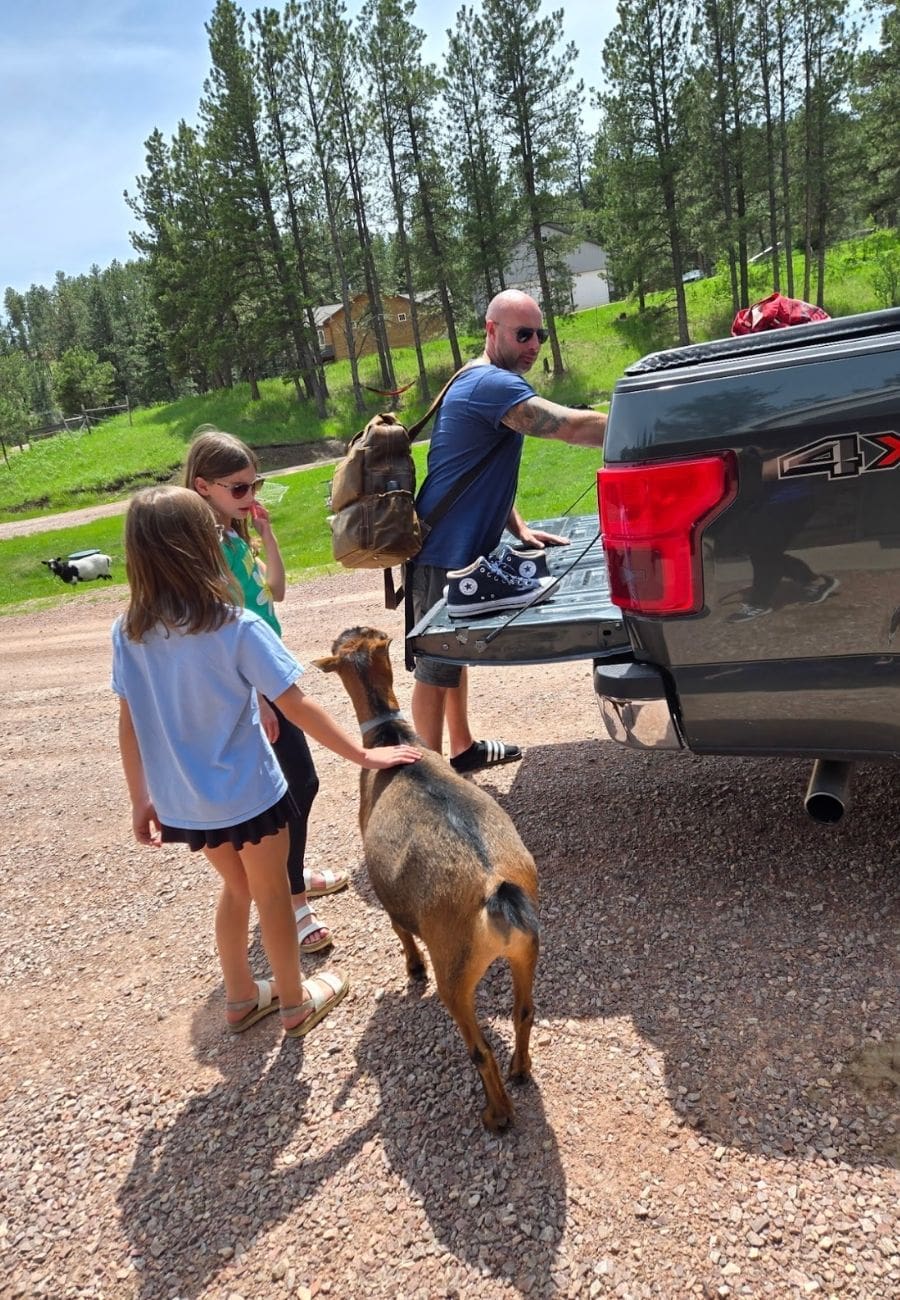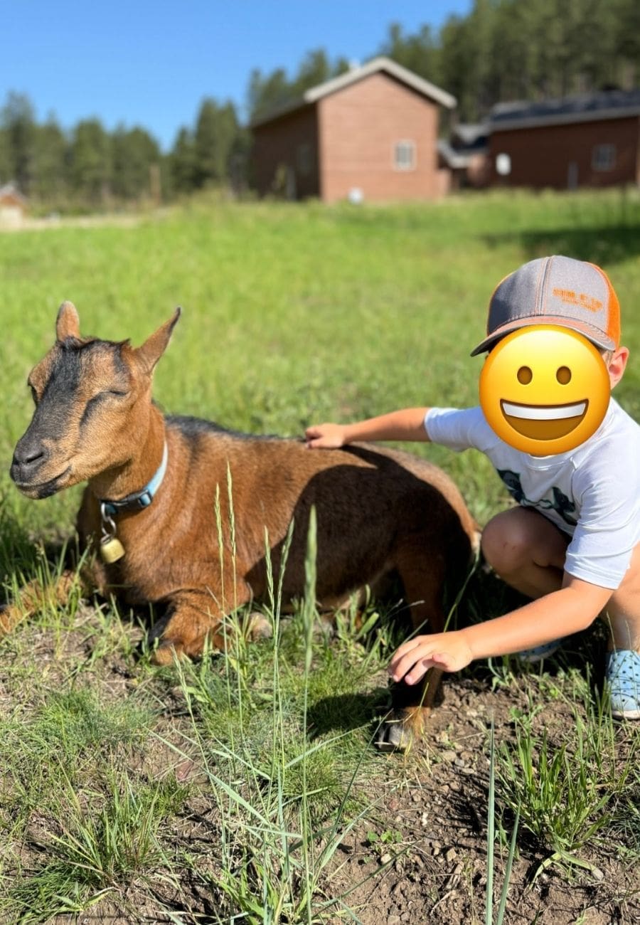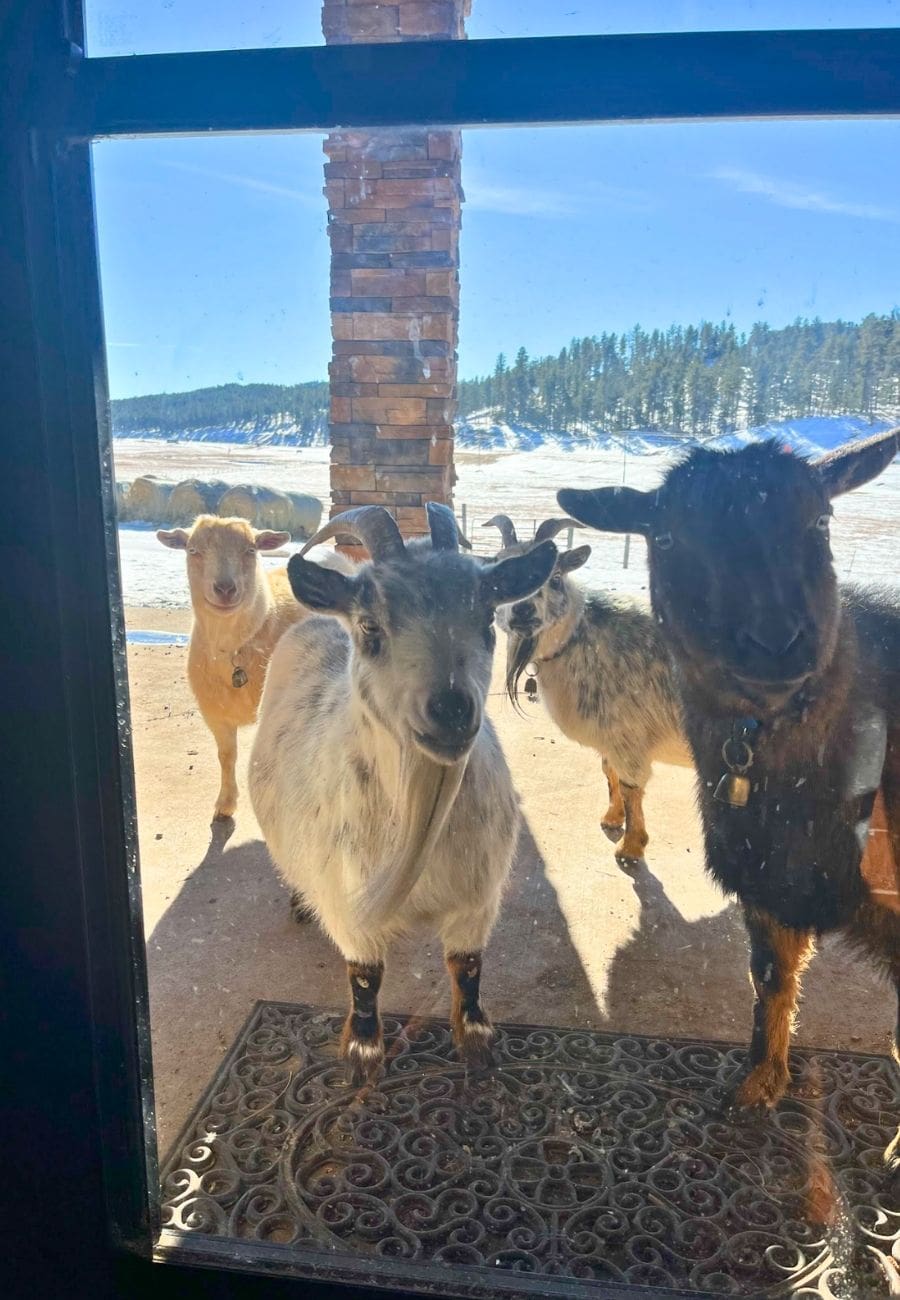 We are often asked how we keep them on the property without fences. The truth is that there isn’t a fence or gate on the property they haven’t gotten out of. With so many acres of fencing they were always finding a way under, though, or over! So, a few years ago when we were overrun with Canadian thistle we started grazing them outside of the fence in problem areas. We noticed how happy they were just chilling near the cabins and how much the guests enjoyed their antics. Long story short…they’ve been free