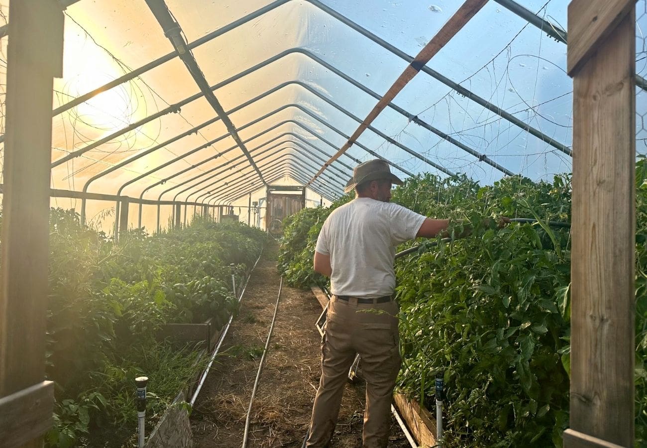 Eventually we added bee hives, a custom watering system, electric fencing, a ceiling wire trellis system, and repurposed used lumber to make taller planting boxes enabling us to add more dirt and compost inside our high tunnel. Two serious hailstorms in 2025 made swiss cheese out of our poly cover, so we added hail cloth to the outside garden for the following growing season and will reskin the high tunnel when we have time, for now Mother Nature has given us the gift of extra ventilation, ha!